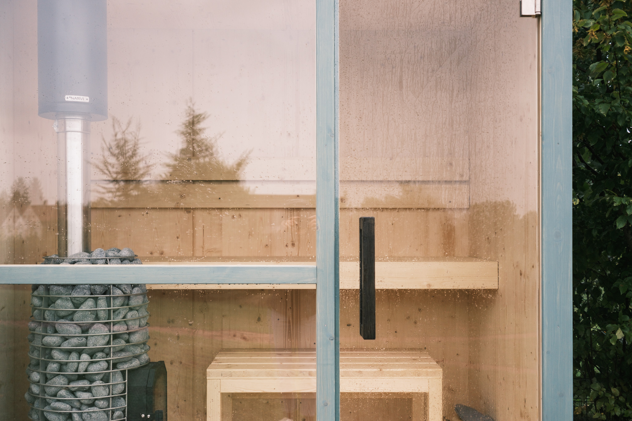 The “Mini” sauna is a compact yet fully equipped solution for 1–3 people, ideal for small gardens or urban plots. Designed with a minimalist but highly efficient approach, it measures 1.4 m × 2.1 m × 2.2 m and features an interior lined with solid wooden panels. A panoramic front window spans the entire width of the sauna, offering unobstructed views of the surroundings and enhancing the feeling of openness and relaxation.