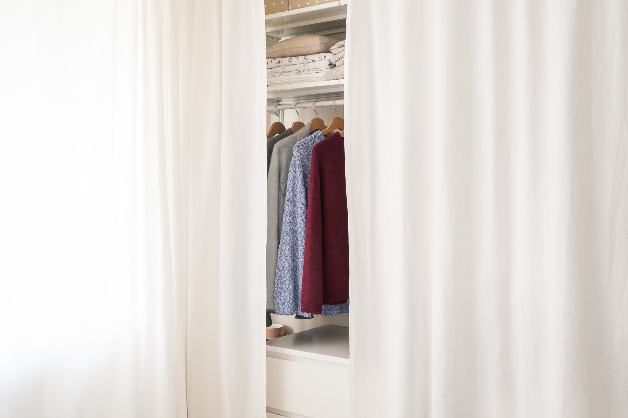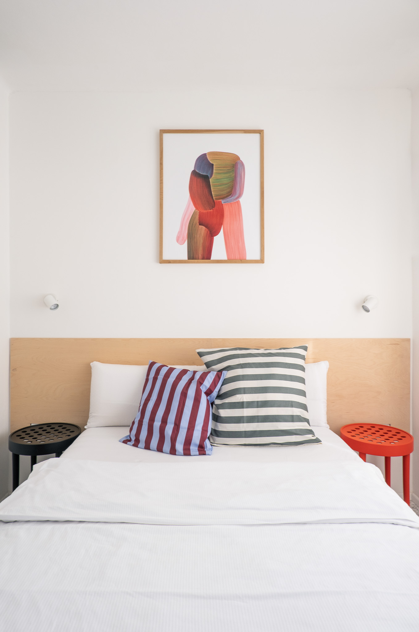 The hallway, bedroom and bathroom work with an almost strictly white palette and continuous terrazzo-effect vinyl flooring to make them feel visually more spacious. The main storage is hidden behind a curtain in the bedroom, where the white backdrop is offset by colourful bedside tables and a selection of contemporary art. Recurring colour accents – such as the Master&Master metal coat rack or custom-made blue-green chests of drawers – enliven the space and visually tie it together.